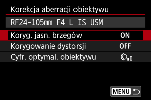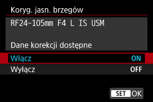 - W przypadku korzystania z obiektywu firmy innej niż Canon zaleca się ustawienie wartości [Wyłącz], nawet jeśli zostanie wyświetlony komunikat [Dane korekcji dostępne].