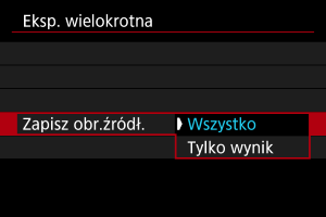 - Aby zapisać wszystkie poszczególne wartości ekspozycji oraz obraz z wielu ekspozycji, wybierz opcję [Wszystko] i naciśnij przycisk