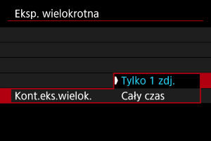 - W przypadku opcji [Cały czas] fotografowanie z ekspozycją wielokrotną będzie działało do czasu zmiany ustawienia z punktu 2 na [Wyłącz].
