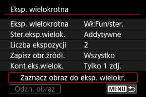 Opcja [Zaznacz obraz do eksp. wielokr.] umożliwia wybór pierwszej pojedynczej ekspozycji z obrazów zapisanych na karcie (). Nie możesz łączyć wielu obrazów już zapisanych na karcie.