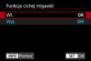 Wyłącza dźwięki zwolnienia migawki, dźwięki towarzyszące wykonaniu operacji oraz wyzwalanie i wyświetlanie lampy błyskowej i innych źródeł światła.