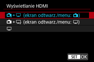 Filmy i czynności w aparacie, takie jak odtwarzanie obrazu lub wyświetlanie menu, są wyświetlane na drugim urządzeniu za pośrednictwem złącza HDMI. Ekran aparatu jest wyłączony. To, co jest wyświetlane na drugim urządzeniu przez HDMI, zostanie nagrane, więc aby ograniczyć nagrywanie do filmów, naciśnij przycisk
