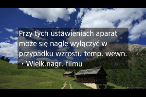 Wskazówki ostrzegają, że aparat może stać się zbyt gorący wewnątrz, jeśli filmy są nagrywane z bieżącymi ustawieniami i jeśli nagrywanie będzie kontynuowane, aparat może wyłączyć się automatycznie.