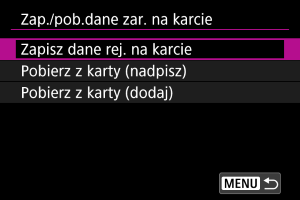 Aby dodać zarejestrowane dane z karty do aparatu, wybierz opcję [Pobierz z karty (dodaj)]. Żadne zarejestrowane dane w aparacie nie zostaną usunięte.