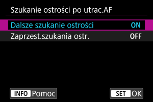 - [Zaprzest.szukania ostr.] to opcja zalecana dla superteleobiektywów lub innych obiektywów, które pokrywają duże obszary regulacji ostrości, aby uniknąć znacznego opóźnienia podczas wyszukiwania ostrości, gdy obiektyw w znacznym stopniu utraci ostrość obrazu.