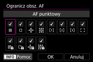 Możesz ograniczyć dostępne obszary AF do tych, z których normalnie korzystasz. Wybierz dostępne obszary AF, które mają być wyświetlane, a następnie naciśnij przycisk , aby dodać znacznik wyboru [