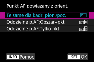 Funkcja pozwala na ustawienie odrębnych typów obszarów AF lub pozycji punktów AF podczas fotografowania w pionie i w poziomie.