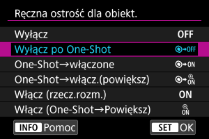 Zapewnia funkcję [Włącz (rzecz.rozm.)] i umożliwia powiększenie obszaru ostrości poprzez obrót pierścieniem ostrości obiektywu po wykonaniu operacji One-Shot AF.