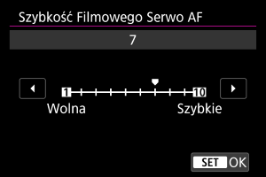 Można ustawić szybkość AF dla funkcji Filmowy Serwo AF. Ta funkcja jest włączona, gdy opcja [Filmowy Serwo AF] w menu [: Filmowy Serwo AF] jest ustawiona na [Włącz], gdy używane są obiektywy zgodne z funkcją powolnego przejścia ostrości podczas nagrywania filmu*.