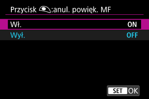 Ustawienie tej funkcji na [Wł.] umożliwia anulowanie powiększonego widoku poprzez naciśnięcie spustu migawki do połowy podczas fotografowania w trybie ręcznej ostrości dla obiektywu.