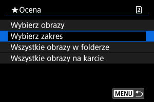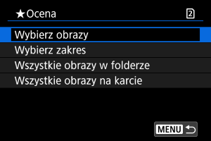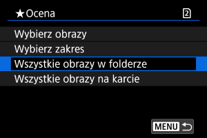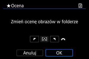: Ocena] i opcji [Wszystkie obrazy w folderze] lub [Wszystkie obrazy na karcie] spowoduje ocenę wszystkich obrazów w folderze lub na karcie.