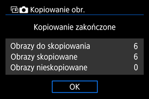 Jeśli w folderze docelowym lub na karcie znajduje się już obraz o tym samym numerze pliku, wyświetlane są opcje [Pomiń obraz i kontynuuj], [Zastąp istniejący obraz] i [Przerwij kopiowanie]. Wybierz metodę kopiowania, a następnie naciśnij przycisk