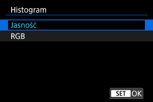 Histogram przedstawia poziomy sygnałów w całym zakresie tonalnym. Dostępne są jasność wyświetlacza (dla sprawdzania ogólnego poziomu ekspozycji i gradacji) oraz wyświetlacz RGB (do sprawdzania nasycenia i przejść koloru czerwonego, zielonego i niebieskiego). Można przełączyć wyświetlany histogram, naciskając przycisk , gdy ikona [