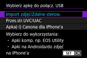Wybierz jeśli zamierzasz skorzystać z EOS Utility po podłączeniu do komputera lub jeśli użyjesz aplikacji systemu Android lub aplikacji Photos w wersji na iOS.