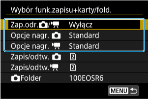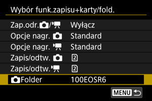 W przypadku dwóch kart w aparacie można ustawić sposób nagrywania na nich oraz wybrać karty używane do nagrywania i odtwarzania. Można również ustawić foldery do zapisywania zdjęć.