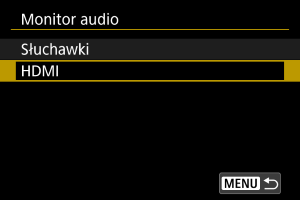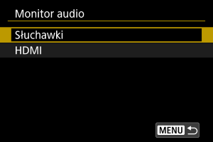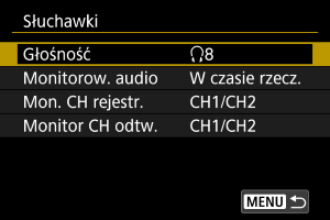 Możliwe jest wybranie ścieżki audio w trakcie nagrywania filmu, która będzie słyszana w słuchawkach. Aby zredukować szum w nagraniu, skonfiguruj [Reduk. zakł.audio] ().