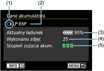 Można sprawdzić stan wykorzystywanego akumulatora. Rejestrując w aparacie wiele akumulatorów, można sprawdzić ich przybliżoną pozostałą pojemność i historię użycia.