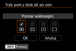 Dla każdego trybu pomiaru można określić, czy ekspozycja ma być blokowana (blokada AE) po uzyskaniu ostrości obiektów w trybie One-Shot AF. Ekspozycja zostanie zablokowana na czas przytrzymywania spustu migawki do połowy. Wybierz tryby pomiaru dla blokady AE i dodaj znacznik wyboru []. Wybierz [OK], aby zarejestrować ustawienie.