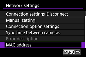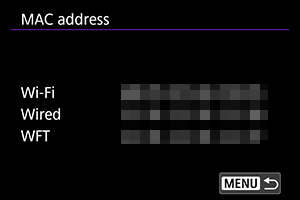 • The MAC address for [Wi-Fi] (with camera built-in), [Wired], and [WFT] (transmitter) is displayed.