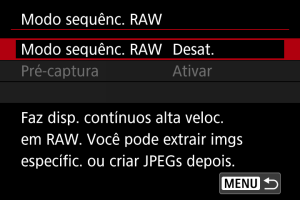: Modo sequênc. RAW] reverte para [Desat.] quando o interruptor de alimentação estiver definido para