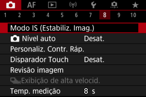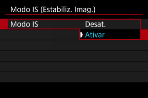 Estabilização de imagens pela câmara reduz a vibração da câmara ao tirar fotografias. Defina como se segue [Modo IS] para [Ativar] quando utilizar objetivas sem IS. Com objetivas equipadas com IS, a vibração da câmara é reduzida usando tanto a estabilização da câmara como a da objetiva. Ao usar objetivas IS que não possuem um interruptor IS, defina [Modo IS] para [Ativar]. Observe que o [Modo IS] não é exibido quando utiliza objetivas IS que possuem um interruptor IS. Nesse caso, definindo o interruptor IS da objetiva para combina a estabilização pela objetiva e pela câmara.