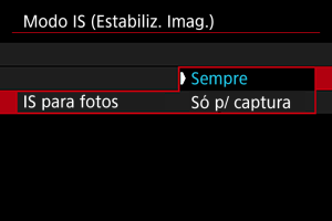 - [Só p/ captura]: A estabilização de imagem está ativa apenas no momento do disparo.
