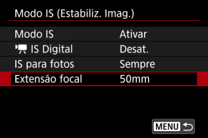 - [Extensão focal] não é apresentada quando estão ligadas objetivas que suportam comunicação de objetivas.