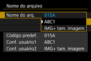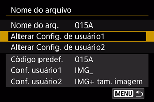 A definição do utilizador 1 permite registar quatro carateres à sua escolha. A Definição do utilizador 2 adiciona três carateres iniciais registados à sua escolha a um quarto caráter que representa o tamanho de imagem que é adicionado automaticamente depois de fotografar.