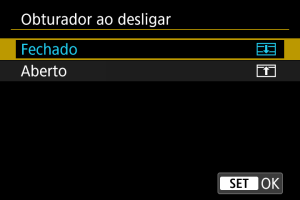 Pode definir se pretende deixar o obturador aberto ou fechado quando o interruptor de alimentação da câmara é colocado na posição .