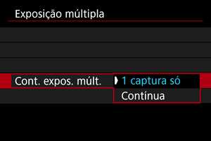 - Com [Contínua], o disparo com exposições múltiplas continua até que a definição no passo 2 seja especificada para [Desat.].