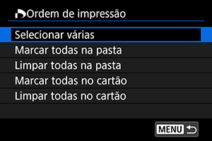 Se selecionar [Limpar todas no cartão], a ordem de impressão para todas as imagens no cartão é apagada.