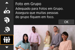 Utilizar o modo [] (Foto em Grupo) para tirar fotografias de grupo. Pode fotografar as pessoas, desde as primeiras da linha da frente e sucessivamente as de trás, todas em foco.