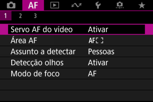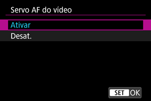 Para manter a focagem numa posição específica, ou se preferir não gravar sons mecânicos da objetiva, pode parar temporariamente Servo AF de Vídeo tocando em [