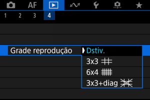 Pode apresentar uma grelha sobre as fotografias mostradas no visor de imagem única no ecrã de reprodução. Esta função é prática para verificar a composição da imagem e também se a imagem tem alguma inclinação vertical ou horizontal.