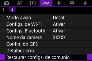 • Todas as definições de comunicação sem fios podem ser apagadas selecionando a opção [Configurações de comunicação] para [Outras conf.] em [Configuração: Restau. câmera].