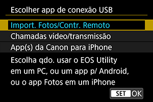 Selecione se usará o EOS Utility após se ligar a um computador ou se usará aplicações Android dedicadas ou a versão iOS de Photos.