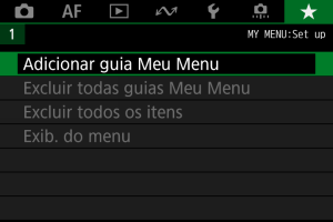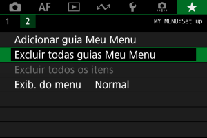 Pode apagar todos os separadores O Meu Menu criados. Se selecionar [Excluir todas guias Meu Menu], todos os separadores de [MY MENU1] a [MY MENU5] serão eliminados e o separador [] voltará à predefinição.