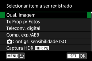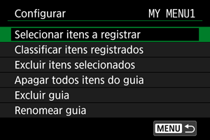 Pode alterar a ordem dos itens registados em O Meu Menu. Selecione [Classificar itens registrados], selecione um item a reordenar e prima o botão