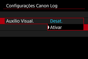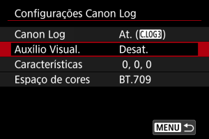 - Definir esta funcionalidade para [Ativar] não afeta os vídeos gravados no cartão, que são gravados usando as características do Canon Log. Da mesma forma, a saída de vídeo HDMI tem características Canon Log, e auxílio visual não é usado para isso.
