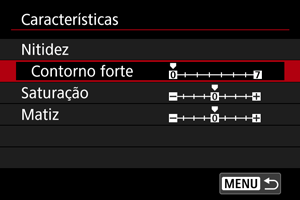 Ajuste conforme necessário. Selecione uma opção ([Nitidez: Contorno forte], [Saturação] ou [Matiz]), ajuste o nível do efeito e depois carregue no botão .