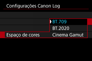 Escolha [BT.709], [BT.2020], ou [Cinema Gamut] como espaço de cor ao gravar em cartões.