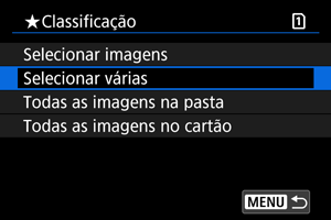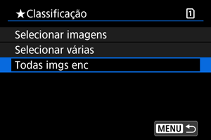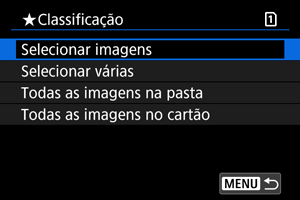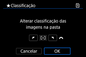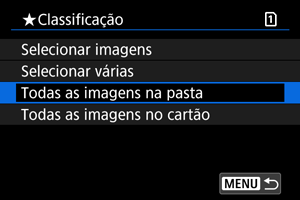 : Classificação], quando selecionar [Todas as imagens na pasta] ou [Todas as imagens no cartão], todas as imagens na pasta ou no cartão serão classificadas.