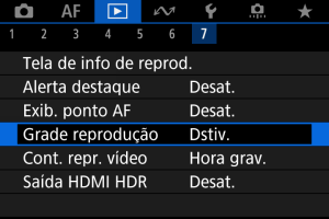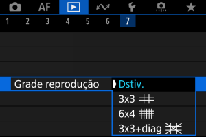 Pode apresentar uma grelha sobre as fotografias mostradas no visor de imagem única no ecrã de reprodução. Esta função é prática para verificar a composição da imagem e também se a imagem tem alguma inclinação vertical ou horizontal.