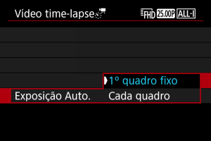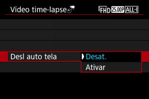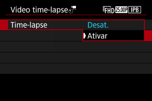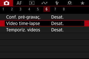 - Para cancelar a gravação de vídeos time-lapse, defina [Time-lapse] para [Desat.].
