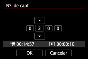 - Se definir o número de disparos para 3600, o vídeo time-lapse terá a duração de aprox. 2 min. em NTSC e aprox. 2 min. 24 seg. em PAL.