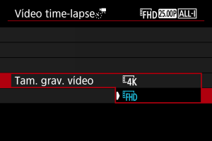 ]) aparece a vermelho se a definição [Nº. de capt] resultar num tamanho de ficheiro que exceda 4 GB para um cartão que não esteja formatado em exFAT (). Se continuar a gravar nesse estado e o tamanho do ficheiro de vídeo atingir 4 GB, a gravação de vídeo time-lapse irá parar.