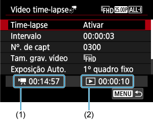 - Mesmo que o tempo de reprodução do vídeo time-lapse seja inferior a 1 seg., será criado um ficheiro de vídeo na mesma. Neste caso é indicado, “00'00"” em [Tempo reprod.].