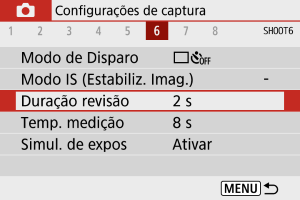 Defina para [Manter] para manter a imagem captada apresentada depois de disparar, ou defina para [Desat.] se preferir que as fotografias não sejam apresentadas.