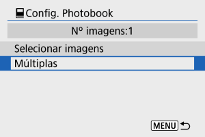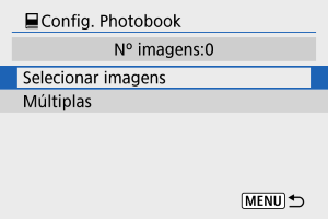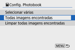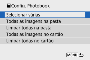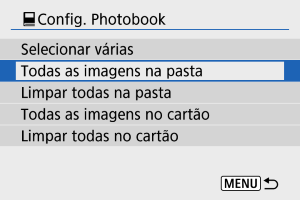 - Todas as imagens na pasta ou no cartão são especificadas para o livro de fotografias quando seleciona [Todas as imagens na pasta] ou [Todas as imagens no cartão] na opção [Múltiplas] para [