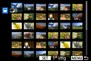 Ao olhar para as imagens no visor de índice, pode especificar o intervalo (ponto inicial ao ponto final) de imagens a ser especificado para um livro de fotografias de uma só vez.